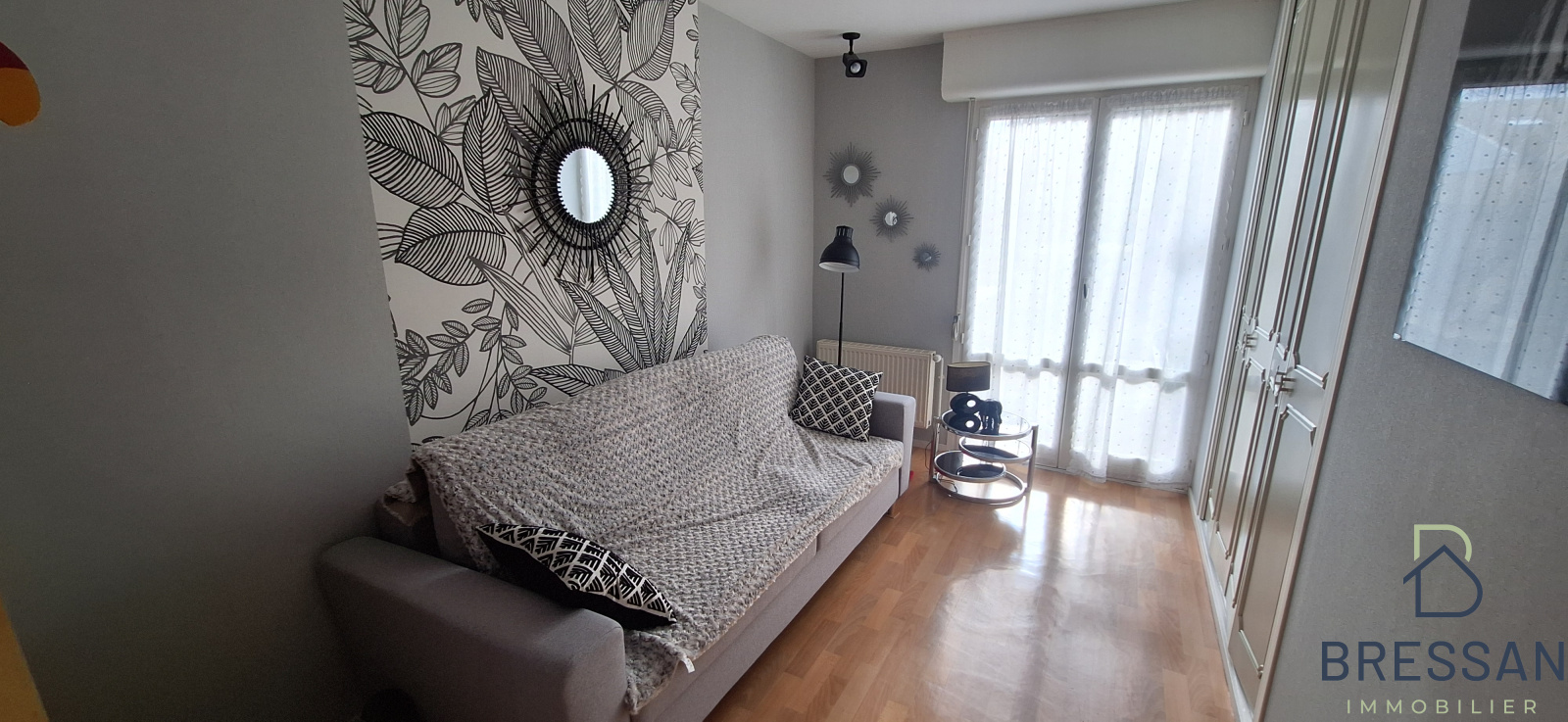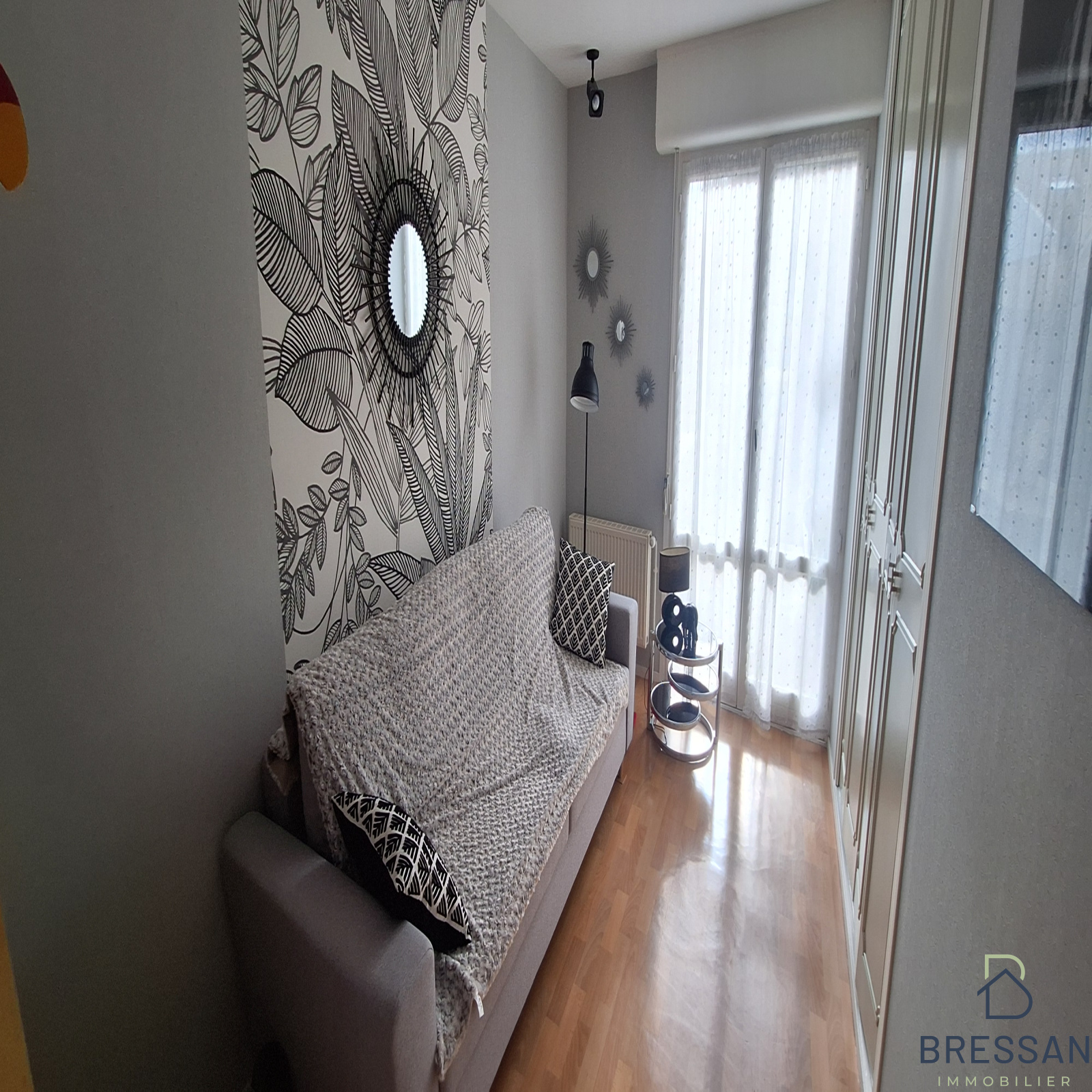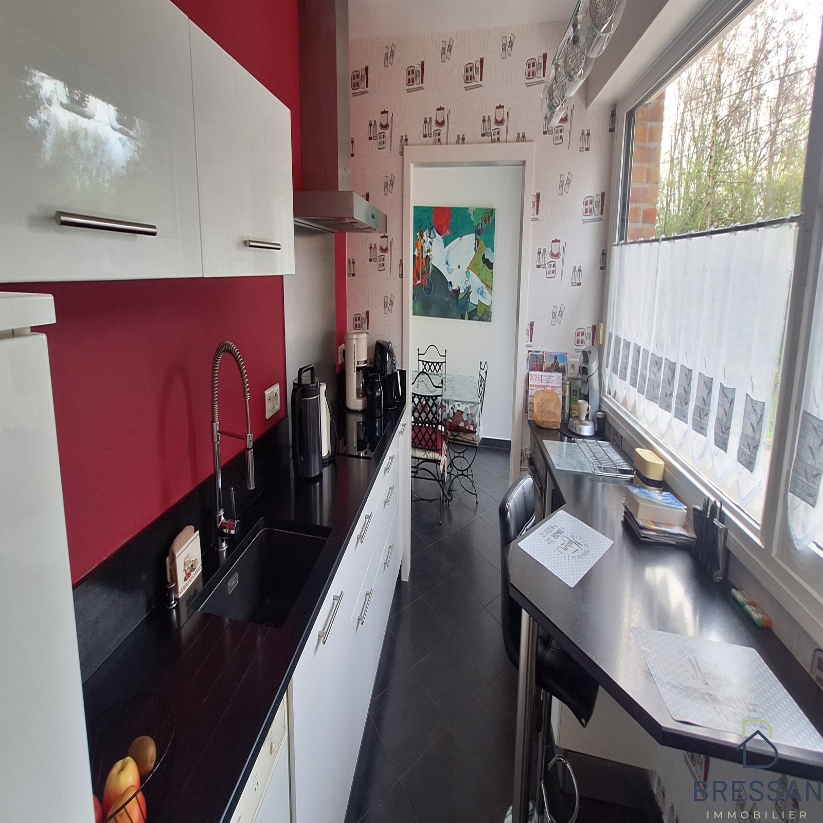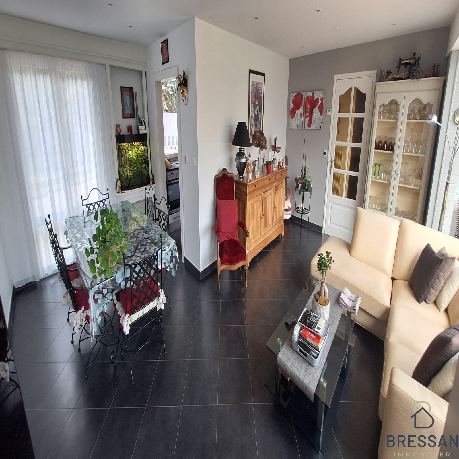 Hall d'entrée avec placards, WC, séjour très lumineux de 43m², cuisine entièrement équipée avec coin repas 2 personnes.