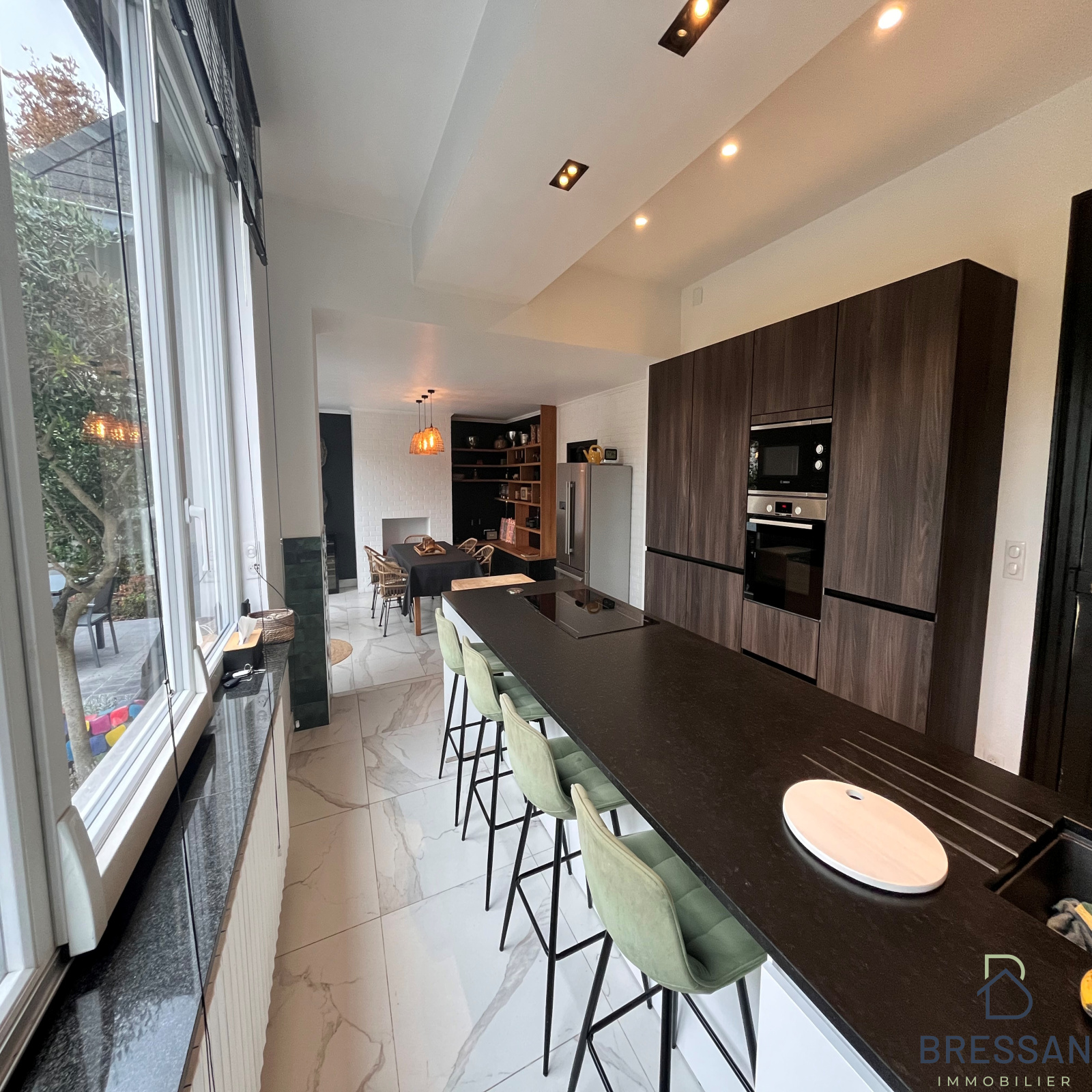 Elle propose un spacieux séjour traversant, une cuisine entièrement équipée avec sa salle à manger, une buanderie, une salle de douche et un bureau en rez-de-chaussée.