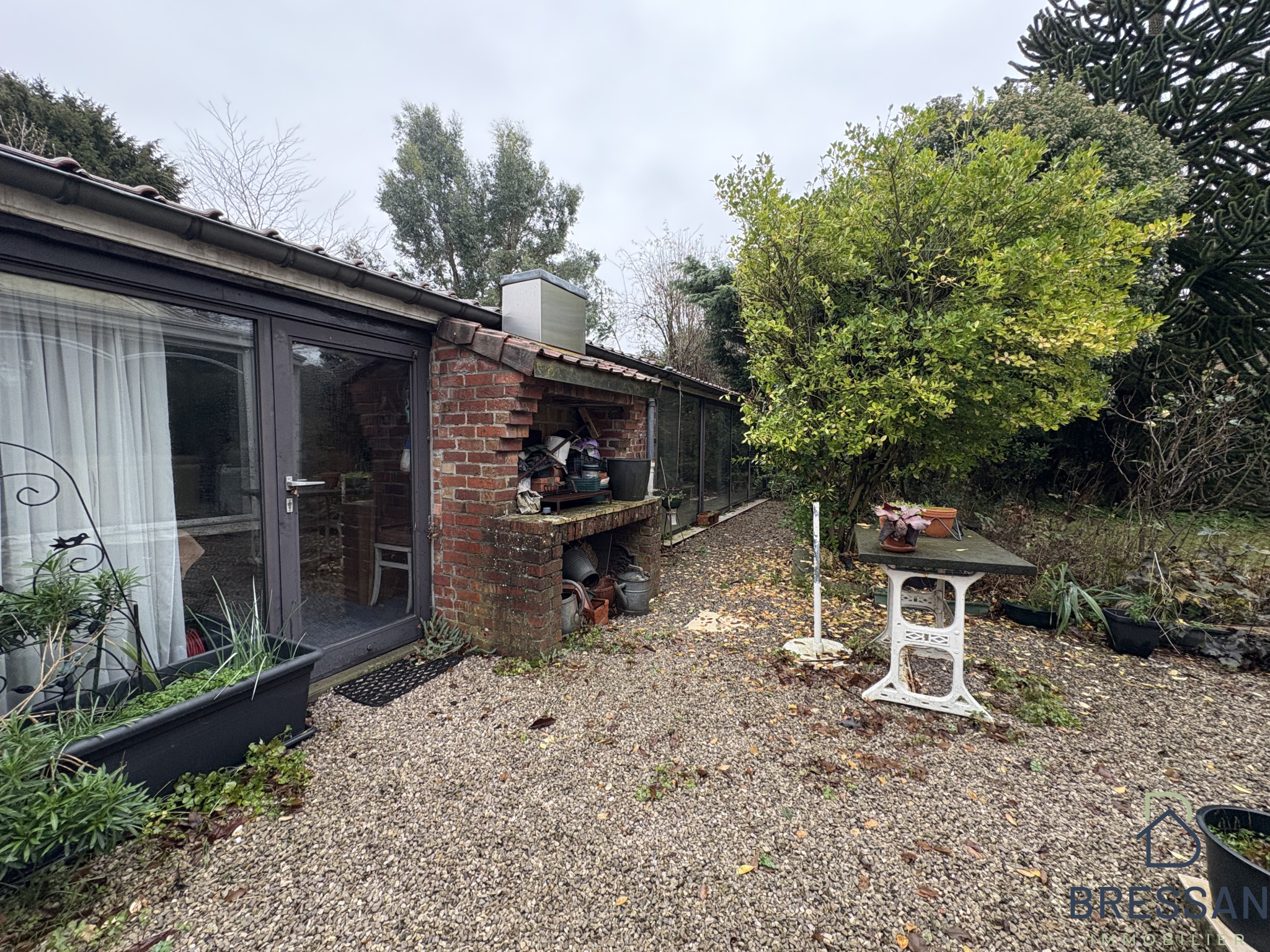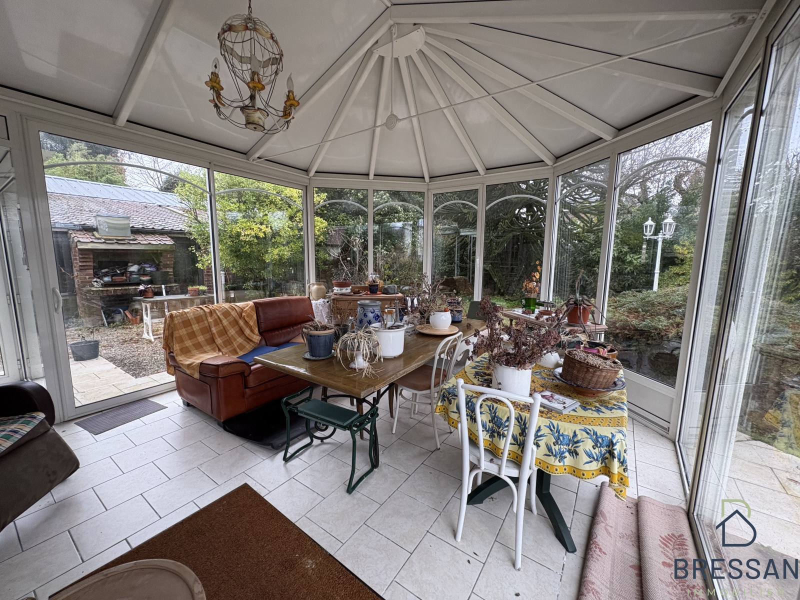 Bâtie sur une parcelle de plus de 1100m² exposée plein Sud, la maison se compose au rez-de-chaussée d'une entrée avec WC, d'un espace de vie lumineux avec cheminée et d'une grande véranda, d'un bureau et d'une buanderie pouvant devenir un espace parental.