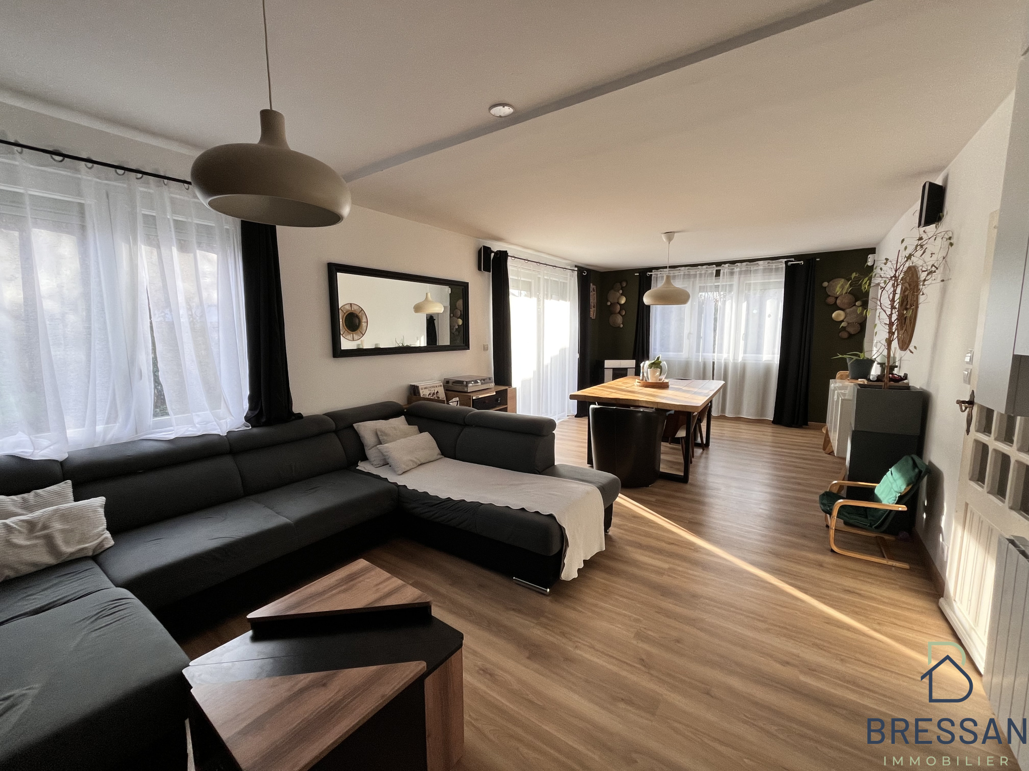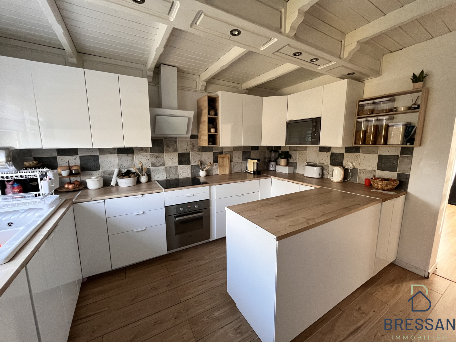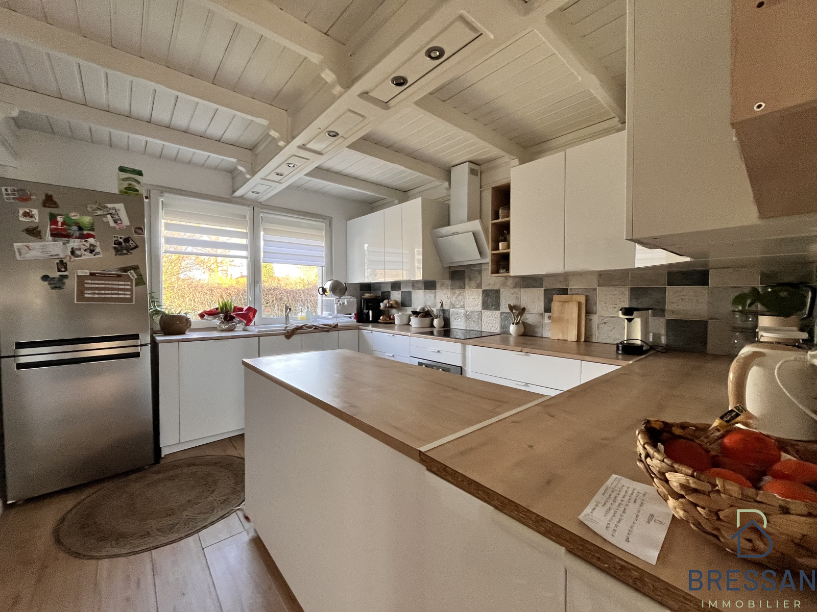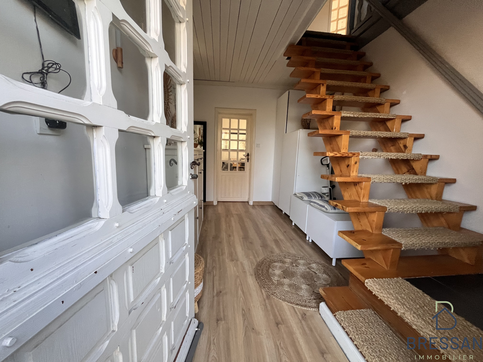 Au rdc, une belle entrée, un salon séjour sur jardin avec poële à granules, une grande cuisine équipée. et une salle de bians avec baignoire.