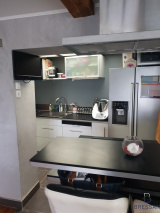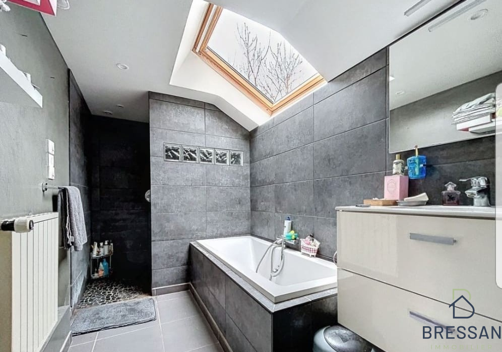 Belle pièce de vie lumineuse de 40m² avec poele à bois, espace buanderie, salle de bains avec douche et baignoire, WC séparé.